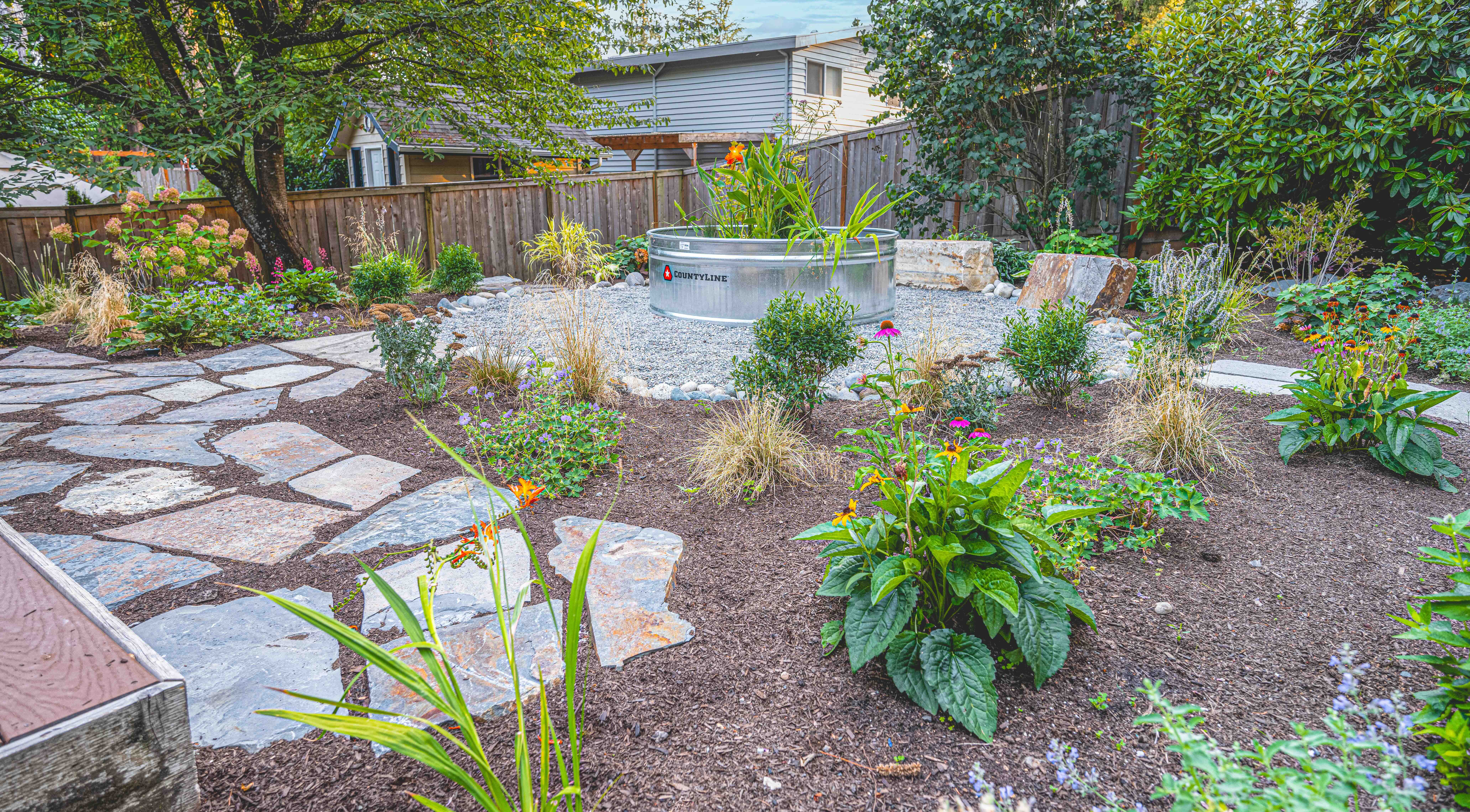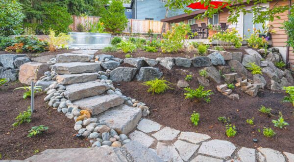 Imagine stepping into your own personal oasis, a dream space that transports you to a world of natural wonder, surrounded by a beautiful landscape project, filled with lush greenery and enchanting height changes. Every corner of this garden offers a unique program area for you to sit, relax, and reflect. From the flagstone path that leads you through the space, to the pea gravel walkways that invite you to explore, this design truly captures the magic of nature. The boulder walls create visual cues that effortlessly guide you through the space, enchanting your senses at every turn.